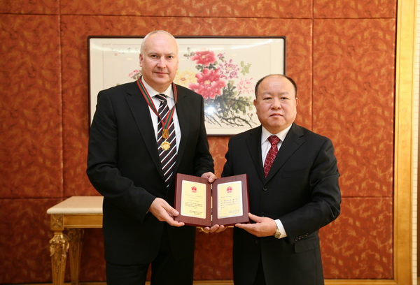 On 13th Jan. the Deputy Director of State Administration of Foreign Experts Affairs Yanguo Liu awards medals to Slovakia expert Karol Vanko, who won 2011 Chinese “Friendship Award”.