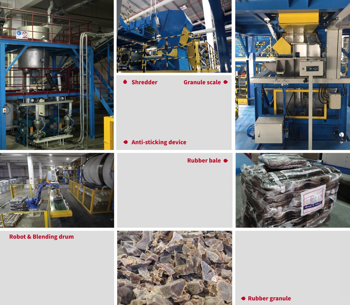 The main equipment of this system includes the shredder, the blending drums and the anti-sticking system. The auxiliary equipment includes the conveyors, the ventilation and weighing system. All these equipment will be integrated by the automation system into an automatic rubber processing system to fulfil the requirement of the production.