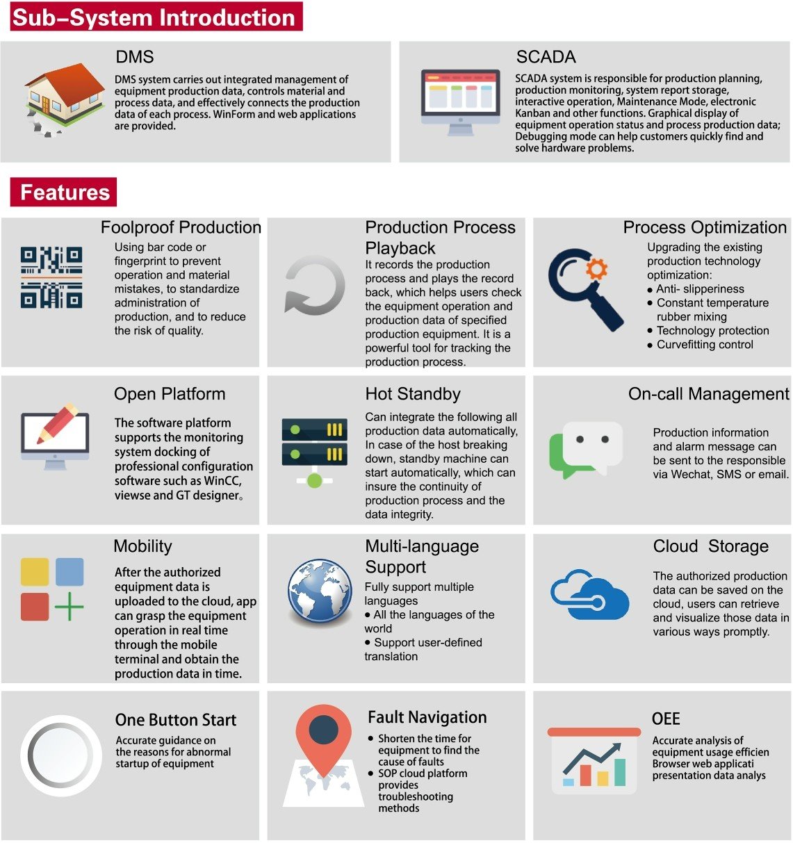 MCC is an integrated information management and control platform for internal mixing workshop. lts main functions include intemal mixing workshop equipment process management, plan management, production monitoring, data analysis, process traceability and statistical authority management. It can control the equipment involved in an internal mixing production line, including Upstream System、Downstream System、Mixer、 Small Chemical Weighing System, etc.