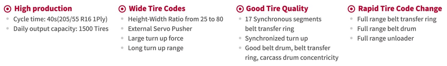 highly automatic model with short cycle time, high output, wide tire codes range, good tire quality, and rapid tire code change function