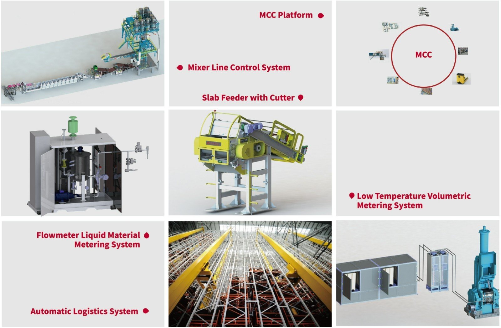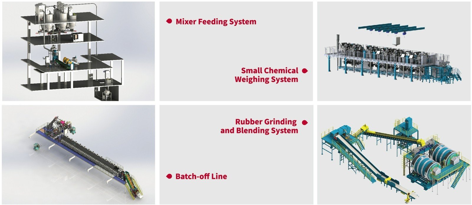 Automatic weighing and automatic production are realized by advanced automation equipments such as mixer feeding system, small chemical weighing system, rubber grinding and blending system, and one–step mixing system. Automatic logistics and automatic storage are realized by using advanced automation warehouse logistics equipments such as AGV, RGV, EMS, robot and stereoscopic warehouse. Combining advanced information technology such as bar code, RFID, MES and robot to realize workshop informatization and digitization, using intelligent technology such as artificial intelligence, large data analysis, APS advanced scheduling algorithm to realize workshop intelligent production and intelligent service, providing customers with high efficiency, high quality, low cost, low energy consumption, green and environmental protection intelligence Rubber mixing plant.